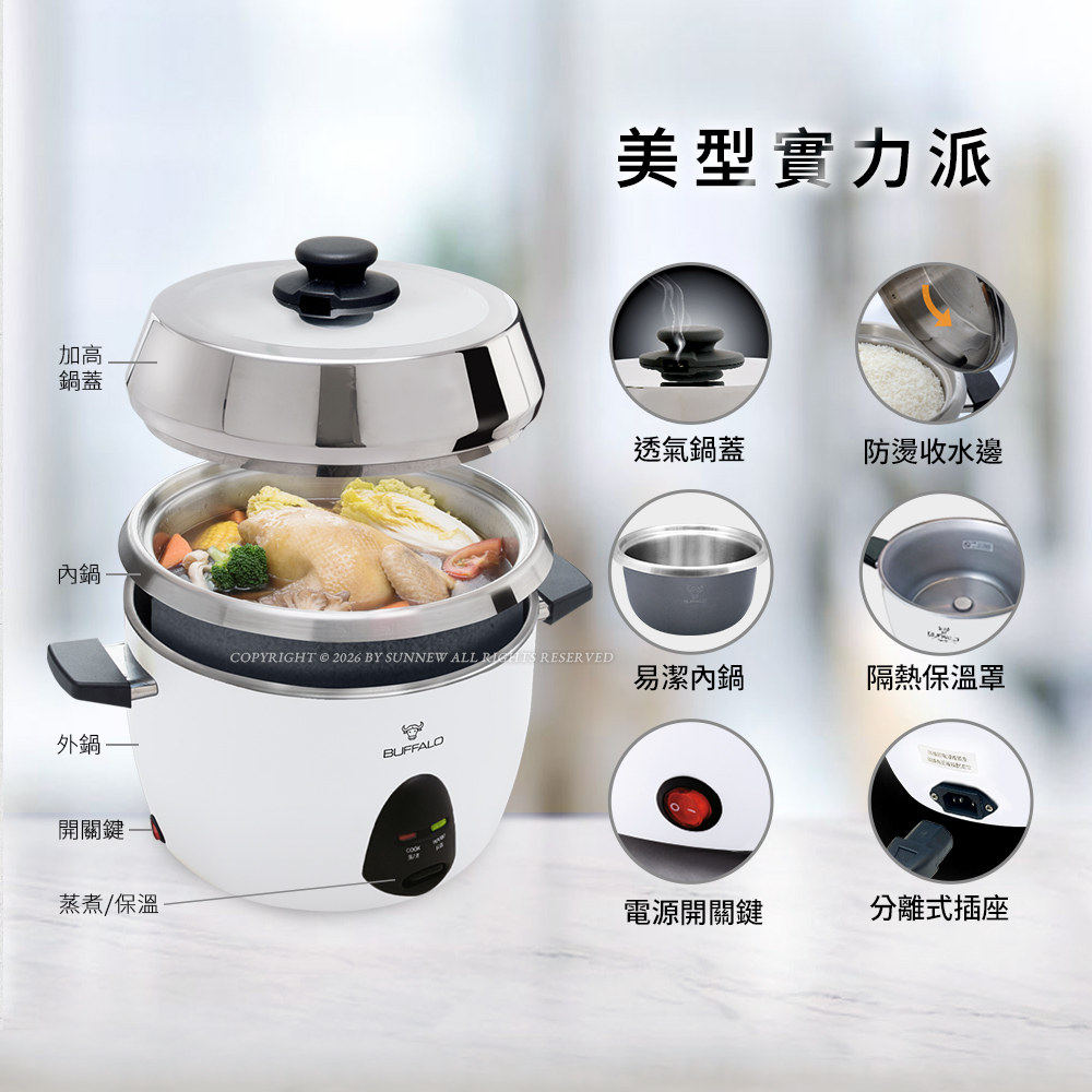 內鍋:內層複合牛頭鋼+外層易潔塗層